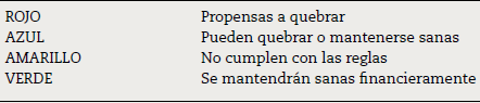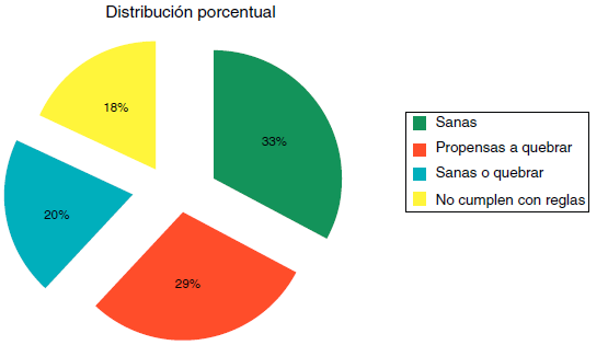 Este trabajo determinó que alrededor del 30% se consideran plenamente sanas financieramente hablando, en tanto que el 29% de las empresas son propensas a quiebra, el 20% podrían continuar financieramente sanas o quebrar y el 18% no cumplen con las reglas, por lo que es complicado determinar su futuro financiero.