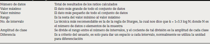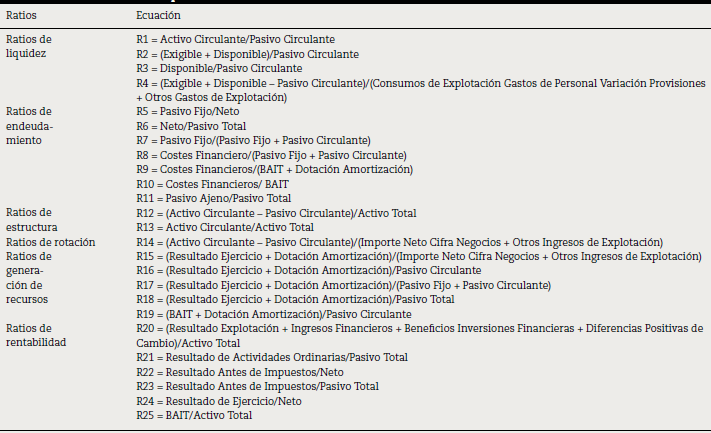 Los datos requeridos son extraídos de los estados financieros de las empresas (fallidas o sanas), y con ellos se calculan los 25 ratios económico-financieros a partir de las ecuaciones mostradas en la tabla 1. Dichas ratios tienen que ser calculados para cada una de las 50 empresas que conforman la muestra utilizada para este estudio, realizando un «emparejamiento» entre 25 de ellas consideradas como fallidas1, y otras 25 empresas consideradas como sanas2 financieramente hablando. Para este cálculo se aplicó la siguiente ecuación: