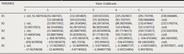 Una vez que se tiene la tabla con los 25 ratios, ya ordenadas en intervalos, se asigna un código a cada intervalo, como se muestra en la tabla 3 (solo se muestra una parte de la tabla generada, a manera de ilustración).