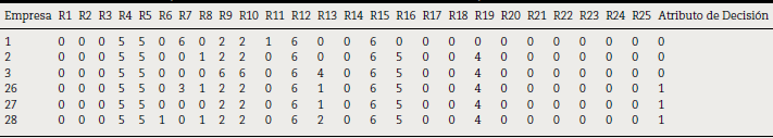 Una vez calculados los ratios de cada una de las empresas se obtiene un sistema de decisión (tabla 2), de 50 × 25, añadiendo una columna en la cual se clasifica cada una de las empresas con un criterio dumy (sanas = 1 y fallidas = 0), quedando entonces una tabla modificada de 50 × 26 datos.
