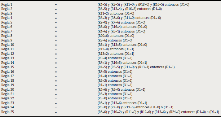 Con el apoyo de la distribución de frecuencias se generaron 25 reglas de decisión con la ayuda del programa ROSE2 (mediante la función LEMS2). Se presentan en la tabla 7.
