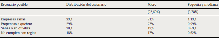 Considerando esta información y la distribución calculada en este trabajo, se establece la siguiente suposición de la ponderación considerando los posibles escenarios futuros determinados en este trabajo, aplicado al universo de las 1.422.117 empresas colombianas que, según Espinosa, Molina y Vera-Colina (2015), han sido censadas por el DANE5, quienes establecen que el 96,4% de las empresas se clasifican como Mipymes, de las cuales el 92,6% son microempresas y el 3,7% son pequeñas y medianas.