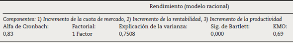 Para determinar la fiabilidad de esta variable se utiliza el alfa de Cronbach; igualmente, para corroborar la validez del concepto se realizan un análisis factorial mediante el coeficiente KMO y la prueba de esfericidad de Bartlett, los cuales arrojan resultados suficientes para validar las variables de rendimiento, tal como se presenta en la tabla 1.
