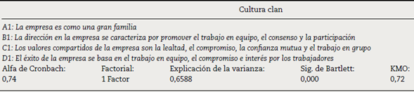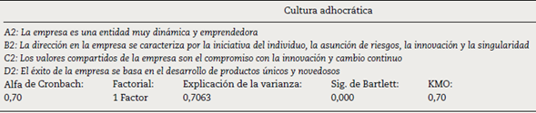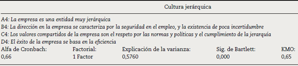 Cultura jerárquica. Para Cameron y Quinn (2006) la cultura jerárquica se caracteriza por la formalización y la estructuración de los procedimientos. Adicionalmente, los estudios de Gálvez Albarracín y García (2011), Maldonado-Guzmán et al. (2016) y Panuwatwanich y Nguyen (2017) utilizan esta variable. Para determinar la fiabilidad de esta variable se utilizó el alfa de Cronbach; además, para corroborar la validez del concepto se llevó a cabo un análisis factorial (coeficiente KMO y la prueba de esfericidad de Bartlett). Estos resultados demuestran en la tabla 5 que la variable cultura jerárquica es fiable y válida.