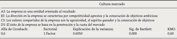 Para determinar la fiabilidad de esta variable se utilizó el alfa de Cronbach; igualmente, para corroborar la validez del concepto se realizó un análisis factorial (coeficiente de KMO y la prueba de esfericidad de Bartlett), el cual muestra con los resultados que la variable cultura mercado es fiable y válida (tabla 4).
