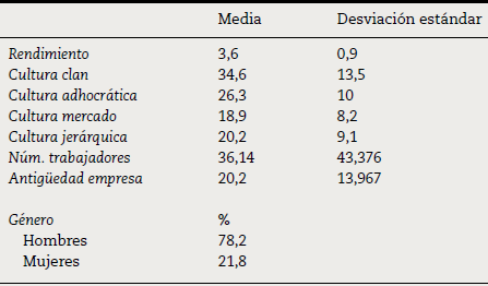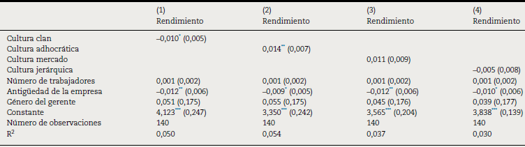 Para contrastar las hipótesis planteadas en esta investigación se realiza una regresión lineal que incluye como variable dependiente el rendimiento y como variables independientes la cultura clan, la cultura adhocrática, la cultura mercado y la cultura jerárquica. Además, se utilizan unas variables de control como son: género, sector y antigüedad de la empresa.