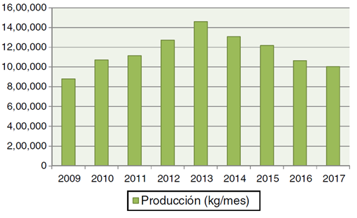 La implementación del Sistema Gestión de Aseguramiento de la Calidad comenzó en el año 2008, con el objetivo de mejorar la calidad de los productos, posicionarse de mejor manera en el mercado y diversificar la producción, tratando de llegar a un público consumidor cada vez más exigente. En el año 2009, lograron la producción de 1.000.000 kg/mes de embutidos, gracias a la adquisición de maquinaria y a la diversificación de las líneas de producción y conquista de nuevos mercados. En la figura 1 se muestra cómo ha sido su incremento de producción promedio mensual desde ese año hasta el 2016. Este crecimiento trajo consigo continuas auditorías de los diferentes organismos ministeriales del Estado, con los cuales se han desarrollado en el tiempo todas las actividades productivas apegadas a los dictámenes legales vigentes en el país.
