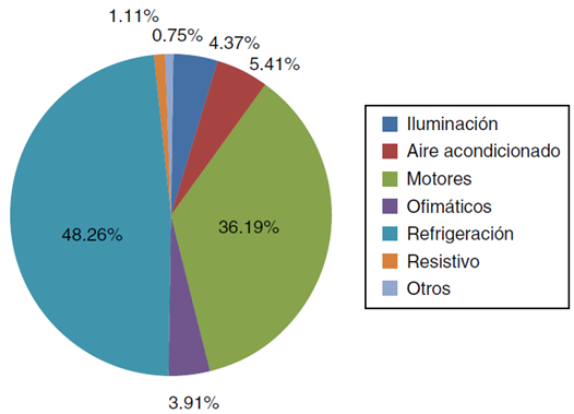 En el año 2013 se comenzó a llevar un registro del consumo de energía eléctrica mensual de la empresa, tanto el facturado por la empresa como el medido a través de equipos portátiles de monitoreo, que permitieran verificar que las acciones implementadas para reducirlo fueran efectivas. Además, se realizó la primera auditoría energética, con la cual se levantó la información de los 367 equipos eléctricos existentes, tanto en las áreas de producción como en las administrativas. En la figura 2 se muestra uno de los resultados más destacados: el consumo de energía eléctrica por uso en la instalación, donde se observa que el 49% se debe a los equipos de refrigeración.