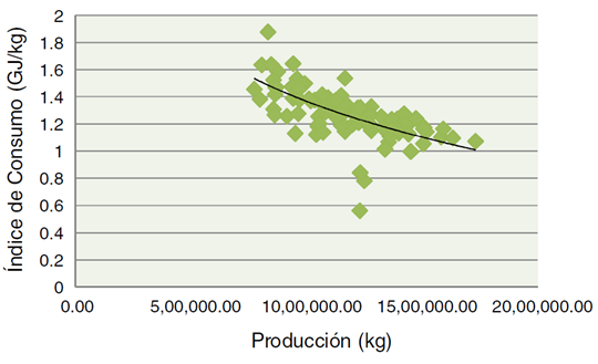 Finalmente, en la figura 3 se muestra la relación del índice de consumo y la producción, en la que se puede observar que, a medida que la producción se incrementa, este índice disminuye, lo que significa que el sistema es más eficiente.