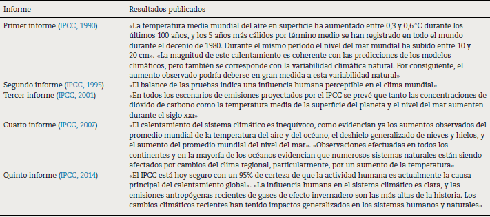 Para convenir en acuerdos para controlar o reducir las emisiones de GEI se crea en el año 1988 el Grupo de Expertos en Cambios Climáticos (IPCC, por sus siglas en inglés). Su misión es evaluar la magnitud y cronología de los cambios climáticos, estimar sus posibles efectos ambientales y socioeconómicos y presentar estrategias de respuestas realistas. De tal manera, que este comienza a generar informes de evaluación del fenómeno, entre 1990 y el 2014. En la tabla 1 se muestran algunos de los comentarios de estos informes.