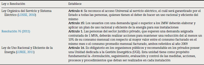 En Venezuela, en el año 2010, se estableció todo un marco regulatorio para los usuarios del servicio eléctrico que deben hacer un uso racional y eficiente de la energía; entre estos, los del sector industrial (Vásquez et al., 2015:15-25). En la tabla 2 se muestran de manera general las leyes y resoluciones publicadas y aplicadas al sector industrial privado.