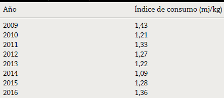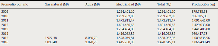 Dentro de los indicadores llevados para verificar la efectividad de las acciones implementadas, se encuentra el uso del índice de eficiencia energética, que es una relación entre el consumo de los calificadores energéticos -todos en una misma unidad- y la producción, y que se muestran en la tabla 4. En esta se evidencia que, comparado con el 2009, el año 2016 tiene una disminución en el consumo de sus calificadores energéticos del 30%, con un incremento de la producción del 86% con base en el mismo año.