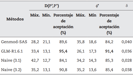Para cada uno de los métodos se indica el porcentaje de veces en que se aceptó el modelo usando D(P’, P*), la estimación de la dispersión y el promedio de la norma. El promedio de la norma se define como ||probabilidad estimada-probabilidad real|| y se denota por δ. Los resultados se brindan en la tabla 1.