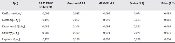 Los resultados en la tabla 2 establecen la superioridad en términos de exactitud del uso de los estimadores Naive siendo el (3.2) ligeramente superior que el (3.1) en la mayoría de las experiencias. Genmod-SAS tiene un buen comportamiento para las llamadas “distribuciones alfa-estables”: Cauchy y normal. Estos resultados califican los estimadores Naive como una opción aparentemente robusta.
