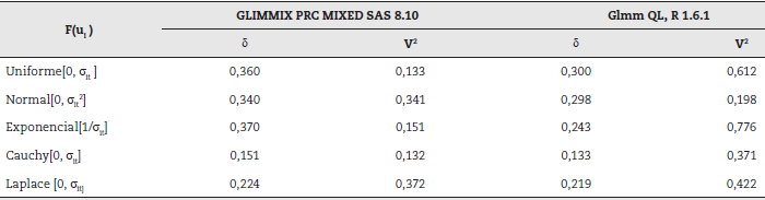 Los resultados del algoritmo programado en el ambiente R 1.6.1 son mejores que los brindados por el del SAS en términos de δ pues están más cerca de cero en todos los casos. Ambos algoritmos establecen siempre la aceptación de la consistencia de la varianza con la distribución asumida, lo que evidencia la no-existencia de superdispersión. Sin embargo, GLIMIX PRC MIXED SAS 8.10 tiene valores menores de V2 en todos los casos.