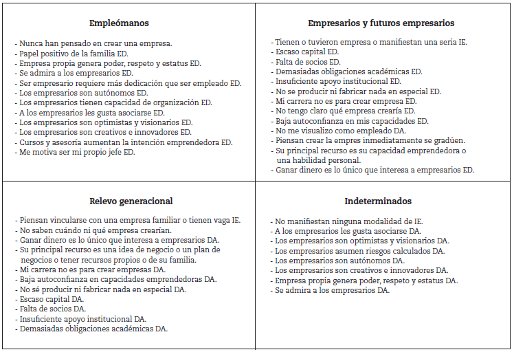 Los empresarios y futuros empresarios se relacionan con estudiantes que tienen o tuvieron empresa o manifiestan una seria IE; se resalta que no perciben como tales los obstáculos analizados en la encuesta. Los empleómanos nunca han pensado en crear empresa, no tienen una imagen favorable del empresario ni de los beneficios de tener empresa propia.
