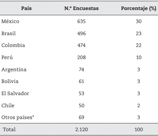 La encuesta se diagramó en español y portugués en la página www.encuestafacil.com, en la que se generó un enlace enviado a los directores de los pregrados en Administración, de una muestra por conveniencia de 128 universidades. En total se obtuvieron 2.411 encuestas, de las cuales 2.120 fueron válidas; la información fue recolectada entre mayo y octubre de 2017 (tabla 1).