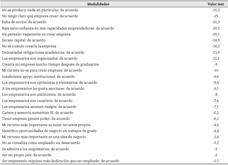 Los estudiantes que nunca han pensado en crear empresa se asocian con las modalidades que configuran una imagen negativa del empresario y a la vez muestran cercanía con las opciones de respuesta que excluyen los beneficios generados al crear una empresa propia.