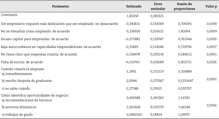 Escaso capital, baja autoconfianza, no tiene claro qué empresa crear y falta de socios son variables que toman como referencia la modalidad en desacuerdo; la razón de proporciones evidencia que hay 1,31 (1/0,761944), 1,37 (1/0,729796), 1,71 (1/0,584512) y 1,24 (1/0,802711) veces más probabilidades, respectivamente, de desarrollar IE cuando se está de acuerdo con estas situaciones que cuando se está en desacuerdo.
