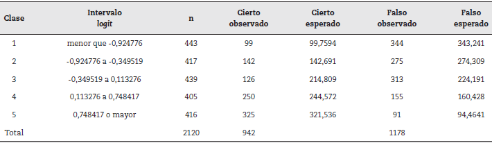 En adición, la prueba de chi cuadrado es óptima para la estimación de la bondad de ajuste del modelo, considerando que la magnitud de las frecuencias es mayor que las frecuencias observadas, con la excepción de la clase 4. En este sentido, como el valor-p es menor que 0,05, se puede rechazar la hipótesis de que el modelo ajustado es adecuado con un nivel de confianza del 95%; lo anterior refleja que la muestra observada no sigue una distribución de chi cuadrado. Expuesto esto, rechazar la hipótesis según la cual sigue una distribución teórica indica que las observaciones no reflejan plenamente las observaciones poblacionales.