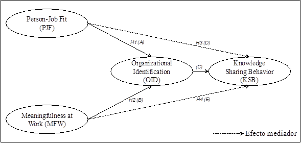 ABSTRACT: The present study explores the degree of participation of organizational identification as a mediator in search for behaviors associated with knowledge sharing, in a hybrid organization. To do that, the influences of both the person-job fit and the level of meaningfulness at work on those behaviors are evaluated. The study is demarcated by individual perceptions of employees of for-profit but social-oriented companies. In this way, a survey is conducted on 321 employees of a Colombian micro-finance institution, whose data are scrutinized through a structural equation model. The obtained results suggest that, despite the importance exerted by the organizational identification on the behaviors of collection and donation of knowledge, the person-job fit turns out being the factor that shows a more direct influence on those behaviors compared to an improving in the levels of meaningfulness. The study concludes by discussing the implications resulting from these findings.