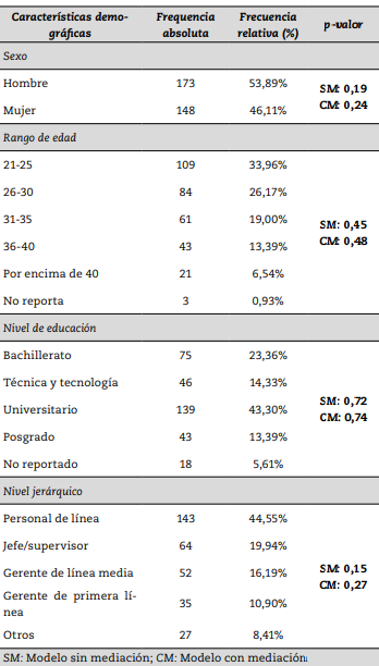 Muestra y procedimiento. La encuesta se aplicó originalmente a 344 empleados de la IMF en mención. El procedimiento de recolección se desarrolla en la sede principal de dicha entidad, y cuenta con el acompañamiento permanente de uno de los autores. Una vez diligenciados y recogidos los formularios, se realiza un proceso de filtrado por el que se dan de baja 23 debido a incoherencias, faltantes y enmendaduras en sus respuestas. De esta forma, se consolida un tamaño de muestra homogéneo y definitivo de 321 formularios que proceden a la tabulación correspondiente.
