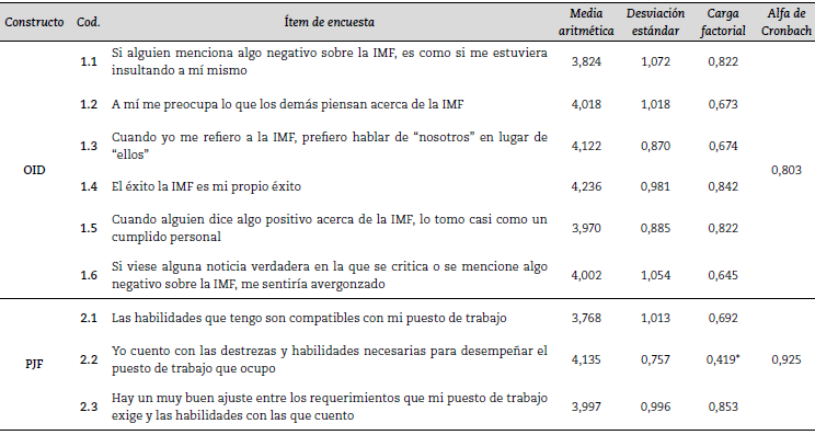 Medidas e instrumento. Además de las variables demográficas y de control definidas (sexo, edad, antecedentes educativos y nivel jerárquico), la encuesta en mención mide cuatro variables latentes cuyos ítems califican los encuestados por medio de una escala Likert de 1 a 5, en la que 1 es completamente en desacuerdo, y 5 completamente de acuerdo. Para la medición de la OID se acude a una escala de seis ítems propuesta por Mael y Ashforth (1992). Asimismo, para la medición del PJF se utiliza una escala de tres ítems propuesta por Cable y DeRue (2002). A fin de medir la MFW se utiliza el estudio de May et al. (2004), quienes diseñaron una escala de seis ítems. Finalmente, a fin de medir la KSB, se acude a una escala de siete ítems propuesta originalmente por Van den Hooff y de Ridder (2004), pero modificada por Lin (2007). Así las cosas, el instrumento en mención incluye un total de 22 variables observables que se tradujeron al español y se adaptaron a la IMF particular. El orden en la presentación de dichos ítems se altera de forma aleatoria en el formulario con el propósito de garantizar la fiabilidad del instrumento (Schell & Oswald, 2013). Las escalas, con sus respectivos ítems, se presentan en la tabla 1.