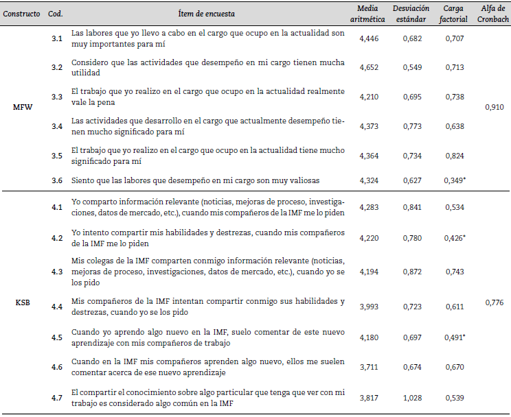 Antes que nada, es necesario resaltar cómo, si se tiene en cuenta el tamaño de muestra analizado (n = 321), correspondiente al 33,65% de la población total de empleados de la IMF observada, el estudio contó -de cierta manera- con un grado admisible de validez externa, lo cual proporcionó también tranquilidad con respecto a las conclusiones a las que se llegó. De hecho, si se quisiera considerar como una muestra aleatoria, se podría aseverar que, bajo un nivel de confianza del 95%, el estudio arrojaría resultados con un margen de error de apenas un 4%. Además, se logró controlar el modelo estructural al conseguir p > 0,05 para cada una de las cuatro variables de control previamente definidas en los dos modelos evaluados (con mediación y sin mediación; véase la tabla 1). También se logró validar la consistencia interna (fiabilidad) de las escalas de medida aplicadas, al obtener valores de alfa de Cronbach > 0,7 en cada variable latente, a pesar de la aleatoriedad de los ítems en el instrumento de medición. Asimismo, al descartar toda carga factorial < 0,5 se aseguró, de cierta manera, la adecuada validez de los constructos evaluados (véase la tabla 2).