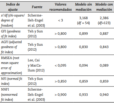 Mediante la reconfiguración del modelo en la etapa de análisis factorial confirmatorio se logró consolidar un ajuste relativamente suficiente en los modelos de medición respectivos y, por ende, una parsimonia admisible en estos (véase la tabla 3). La única excepción ocurrió en la prueba x2/df para el modelo sin mediación, la cual arrojó resultados no tan favorables. Sin embargo, por sus mismas limitaciones relacionadas con el tamaño de la muestra, la intensidad en las correlaciones y la suposición de normalidad multivariante en la data, autores como Schermelleh-Engel, Moosbrugger y Müller (2003) recomiendan su observación con cautela y estiman necesario su contraste con otras pruebas de ajuste, a fin de descartar inconveniencias.