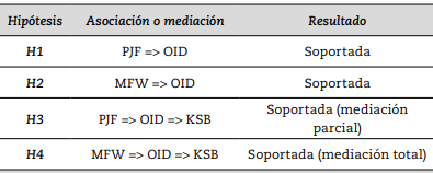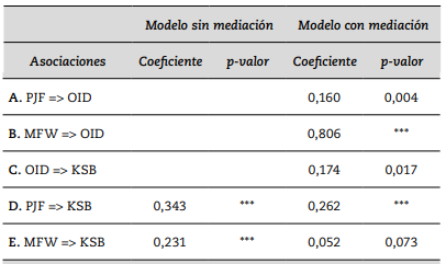 Por último, las asociaciones planteadas se evaluaron, de modo que se obtuvieron evidencias que invitan a pensar que (véase la tabla 4): 1. El PJF se encuentra asociado de forma positiva con la OID; 2. La MFW se encuentra asociada de forma positiva con la OID; 3. La OID se encuentra asociada de forma positiva con el KSB; 4. El PJF se encuentra asociado de forma positiva con el KSB; y 5. No se puede llegar a afirmar que la MFW se encuentra asociada con el KSB; además, se evidencia que: 6. Existe una mediación parcial de OID en la asociación entre PJF y KSB, toda vez que, aparte de la disminución de su coeficiente de un modelo a otro, también se mantuvo significancia estadística (p<0,05) en ambos escenarios; y 7. Existe una mediación total de OID en la asociación entre MFW y KSB, toda vez que además de la disminución de su coeficiente de un modelo a otro, la significancia estadística de dicho vínculo desapareció al evaluar la mediación (p>0,05).