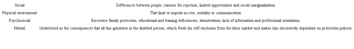 For Pico-Barrionuevo & Torres (2017), p. 191), disability is a concept that evolves and that results from the interaction between people with impairments and the barriers due to attitude and environment that prevent their full and active participation in society, on equal terms with others. For Zhao & Zhang (2018)), the most noticeable change is the idea of inclusive education. Only when barriers are transcended can steps be taken towards inclusion and both persons with disabilities and the organization can experience positive results (Vornholt et al., 2017). Frequently, people with physical or sensory disabilities have been treated as incapable without being disabled. Some "diseases" or "disabilities," from the sociological point of view, that is, behaviors or situations that are considered socially legitimate deviations from normality and that must be "cured," may lack a biomedical basis; they can be simple social constructions (Alemany, 2018, pp. 214-215).