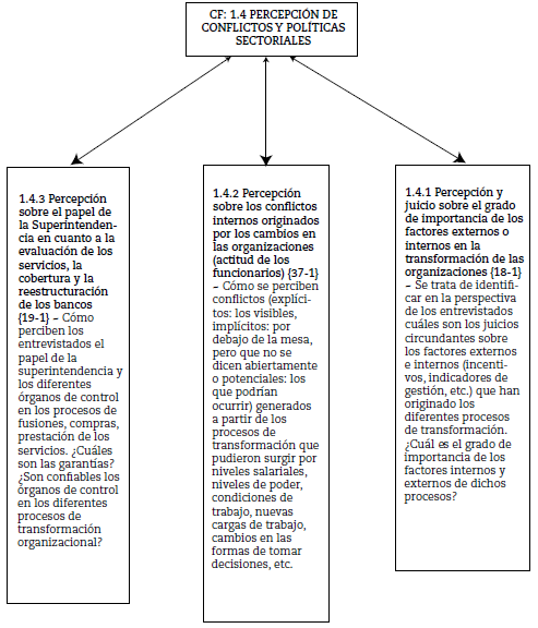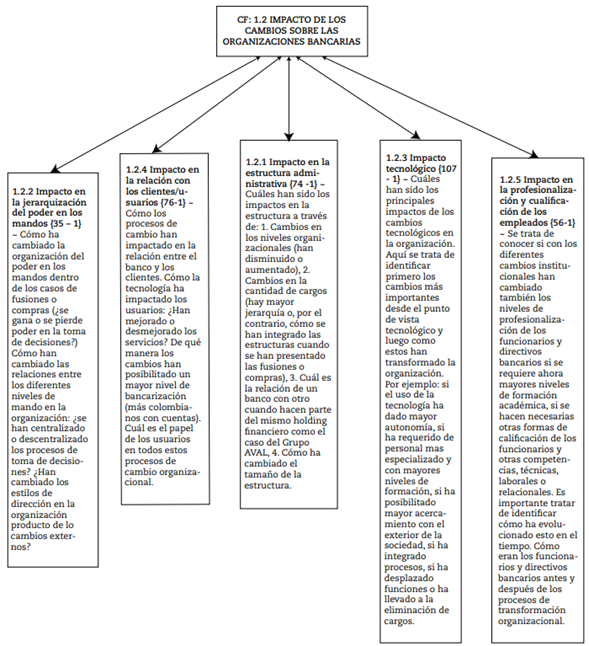 También el sector financiero ha sido uno de los sectores de la economía colombiana con mayores procesos de transformación organizacional, sobre todo entre los años 1990 y 2010. Las fusiones, integraciones, alianzas estratégicas, y todas las formas administrativas y jurídicas han generado cambios significativos en su estructura organizativa, a nivel tecnológico y administrativo para lograr afrontar los cambios del mercado y la competencia, lo que significa una mayor integración de los bancos a través de grupos financieros muy fuertes.
