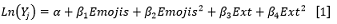 Ln(Y) corresponde al logaritmo natural de la variable dependiente, que puede asumir una de tres formas: comentarios, reacciones y difusiones (shares). α es el término constante. Emojis es una variable continua que representa el número de emojis utilizados en las publicaciones, y se eleva al cuadrado ( 𝐸𝑚𝑜𝑗𝑖𝑠 2 ), para permitir la posibilidad de medir un efecto cuadrático (en forma de U invertida). Ext es otra variable continua, que hace referencia al número de caracteres empleados en el post, como sucede con Emojis, se eleva Ext al cuadrado (𝐸𝑥 𝑡 2 ), para medir posibles efectos de saturación.