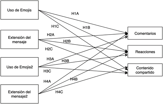Con base en lo anterior, el uso excesivo de emojis y de caracteres, en las publicaciones de marca, puede tener efectos significativos sobre la participación de los usuarios, en forma de eWOM. De ahí, surgen las Hipótesis 3 y 4:
