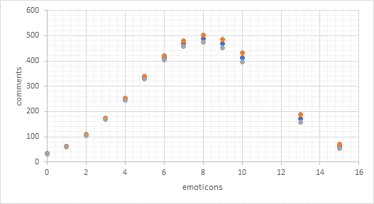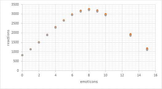 Como se pudo apreciar en la tabla 4, se comprobó la existencia de efectos en forma de “U invertida”, para las variables emojis y extensión de caracteres. Por tanto, se tabularon y graficaron los valores predichos, para obtener los puntos óptimos. A continuación -en las Figuras 2, 3 y 4 se muestran los resultados obtenidos para cada uno de los modelos aplicados frente a la variable emojis.