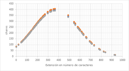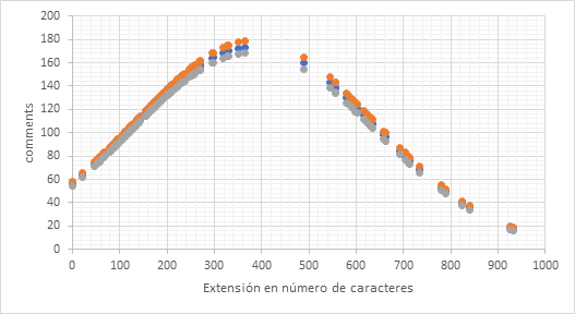 En este caso, el número óptimo de caracteres para comentarios y contenido compartido se sitúa alrededor de 364; sin embargo, para la variable dependiente reacciones, el número óptimo alcanza los 490 caracteres.