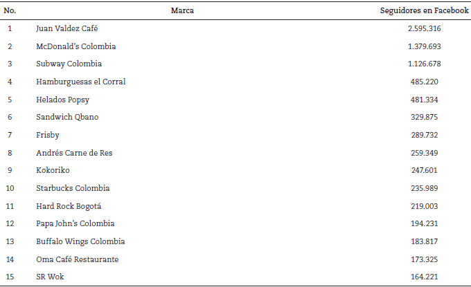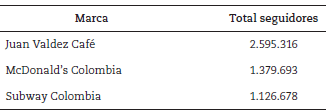 Se realizó un muestreo no probabilístico en el que se escogieron las últimas 75 publicaciones de marca en la red social Facebook. Las marcas de Retail Food seleccionadas fueron las tres primeras con mayor número de seguidores en Colombia: Juan Valdez Café, McDonald’s y Subway (ver Tabla 1).