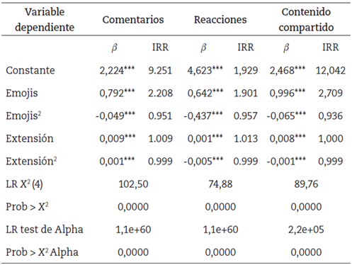 La variable extensión del post también es altamente significativa: 99% en todos los modelos propuestos; presenta, en las tres regresiones, betas positivos. Por tanto, puede afirmarse que, si se aumenta la extensión del post, se incrementan los comentarios, las reacciones y las difusiones. En términos concretos, aumentando un caracter en la descripción de la publicación, se espera que la tasa de incidencia aumente (IRR) 1 en comentarios, reacciones y contenido compartido. Esto le da consistencia a las hipótesis H2a, H2b y H2c.