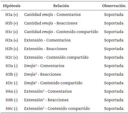 Finalmente, el término cuadrático de la variable extensión presenta relevancia, con un 99% de confianza y signo negativo (tal como sucede con la variable Emo 𝑗𝑖𝑠 2 ). Se espera que si se aumenta un caracter -en la descripción de la publicación, después de alcanzar el punto de saturación- la tasa de indecencia (IRR) disminuya 0.99 en comentarios, reacciones y contenido compartido. Estos resultados, nuevamente, prueban la existencia de un efecto en forma de “U invertida”; lo que, a su vez, demuestra la importancia de las hipótesis H4a, H4b y H4c. En la tabla 5, se presenta un resumen de las hipótesis contrastadas en el modelo propuesto.