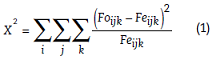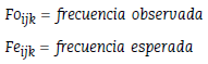 Y en donde el 𝛸 2 se distribuye como una función Chi-cuadrada con 𝑞−1 ∗ 𝑚−1 ∗ 𝑛−1 grados de libertad (Sea 𝑞, 𝑚 y 𝑛 el número de elementos en cada variable).