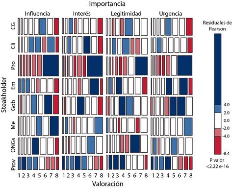 De manera general, al descomponer las valoraciones según el conjunto de constructos asociados a la importancia y el grupo de interés, se encuentran similitudes en sus respectivas tablas, por lo cual es necesario un análisis global que integre las tres variables de manera simultánea. De acuerdo con los parámetros anteriores, el estudio de independencia mediante la prueba de Chi-cuadrado permite dicho análisis, el cual es sintetizado en la figura 1, donde se observa cómo el tamaño de la celda representa la frecuencia observada de respuestas de cada valoración, asignada en cada stakeholder para cada variable latente. A su vez, se registra un esquema de colores relacionado con el valor de los residuales de Pearson, en donde el color azul indica que el valor observado es mucho mayor que el esperado y que, en contraparte, el valor rojo expone que el valor observado es inferior al valor esperado. La presencia de valores por encima y por debajo de los esperados indica la no independencia de las variables y, por tanto, la probable presencia de sesgos en las percepciones bajo análisis. Teniendo en cuenta lo anterior y la obtención de un p-valor < 0,001 (figura 1), es posible determinar la no independencia entre las variables evaluadas; es decir, se rechaza la hipótesis nula y, por ende, se establece la existencia de patrones de respuesta.