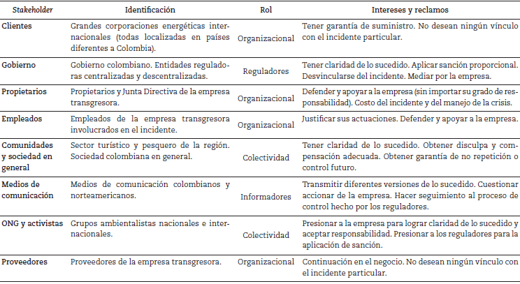 En el 2013 ocurrió una contingencia ambiental en la costa norte colombiana en la cual se vio involucrada una importante compañía minera (Contreras-Pacheco & Claasen, 2018). Dicho incidente tuvo una gran resonancia institucional y mediática en ese país suramericano. Ante dicha situación, diversos actores intervinieron con el propósito de atribuir diferentes grados de responsabilidad y juzgar las acciones posteriores ejecutadas por dicha empresa como producto de la crisis desencadenada. Tomando como referencia el caso en mención, el presente trabajo se propone evaluar el equilibrio en la percepción general sobre la importancia de los diferentes stakeholders asociados a momentos de crisis, de acuerdo con las nociones de influencia, interés, legitimidad y urgencia. Para ello, a partir de una actividad pedagógica, se realiza un estudio soportado en un análisis de correspondencia múltiple, el cual es una técnica estadística tipo inferencial no paramétrica aplicada a una valoración realizada por 139 profesionales experimentados de diversas nacionalidades, que son a la vez estudiantes de distintos programas magisteriales de una escuela de negocios francesa con triple acreditación internacional. En suma, a partir de este trabajo, se pretende abordar la pregunta: ¿cuáles son los niveles de influencia, interés, legitimidad y urgencia atribuidos por los futuros gerentes a los diferentes stakeholders involucrados en una crisis medioambiental?