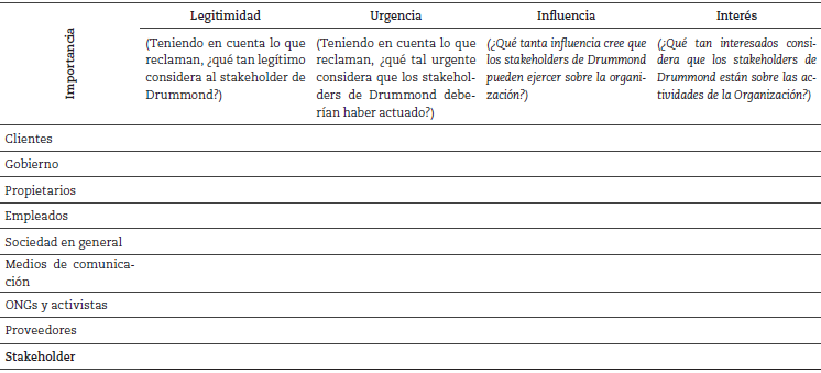 Dichos participantes evaluaron, mediante un formulario digital previamente diseñado, la importancia jerárquica de los reclamos, necesidades o intereses de cada uno de los stakeholders que intervenían en el caso a la luz de cuatro constructos definidos: influencia, interés, legitimidad y urgencia. Esta escala comprende los valores de 1 a 8 sin repetir número, con lo cual se obtiene una clasificación ordenada no repetida. Es necesario resaltar que parte del ejercicio pedagógico consistía en la identificación explícita de los stakeholders respectivos y la definición de sus roles e intereses (de acuerdo con Henriques & Sadorsky, 1999) para el caso particular (véase tabla 1).