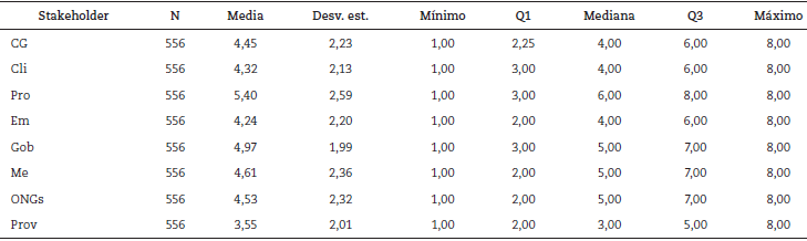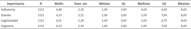 Como aproximación descriptiva, los datos tabulados son analizados teniendo en cuenta los diferentes niveles de cada factor de interés (i.e., importancia y stakeholder). En la tabla 3 se registran los estadísticos de tendencia central y dispersión para la importancia percibida. Estos se aplican a las valoraciones dadas por los 139 participantes, según los cuatro constructos anteriormente mencionados; a partir de los resultados se halla que, ante una crisis medioambiental, se le da más importancia hacia las reclamaciones por parte de los stakeholders enfocadas en la urgencia, seguido del interés. Por otra parte, en la tabla 4 se describen las valoraciones dadas por los 139 participantes, según los ocho stakeholders. Al analizar los estadísticos descriptivos de la valoración asignada se encuentra que existen dos grupos de interés disímiles: por un lado, a los propietarios se les suele asignar una mayor valoración, de hecho, el 50% de las valoraciones se encuentran en el rango entre 6 y 8 (siendo la mediana más alta de los grupos); en contra parte, a los proveedores se les percibe como el grupo de interés con menor importancia en sus reclamaciones.