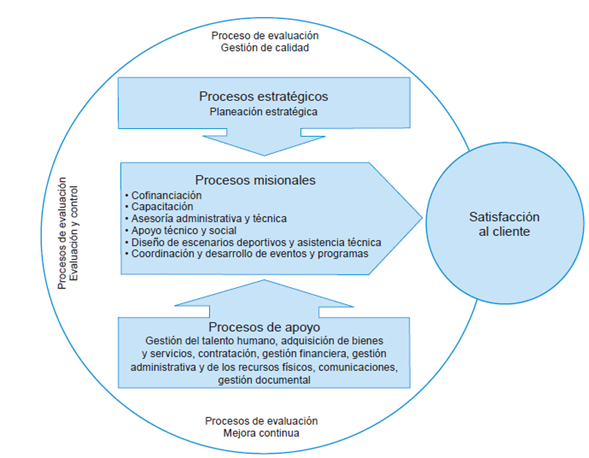 Coldeportes, a través de su política de calidad, se compromete a mejorar sus procesos y servicios continuamente con el apoyo de personal competente, la identificación y control de sus riesgos y la disponibilidad oportuna de los recursos. Su planeación estratégica dentro de la gestión de la calidad se basa en tres procesos: lo misional, de apoyo y de control y evaluación. Por otra parte, el IDRD, dentro de sus componentes institucionales, tiene establecida una política de calidad en la que se compromete a satisfacer las necesidades de sus usuarios en materia de recreación, deporte y parques a través de una gestión eficiente, eficaz y efectiva, en concordancia con el Plan de Desarrollo del Distrito, buscando la mejora continua de los servicios, apoyados en un equipo humano competente. De igual manera, INDEPORTES Antioquia estructura su política de calidad en brindar asesoría, asistencia técnica y cofinanciación con eficacia, eficiencia y efectividad. Su planeación estratégica se centra en los procesos misionales, de apoyo y de evaluación y mejoramiento continuo.