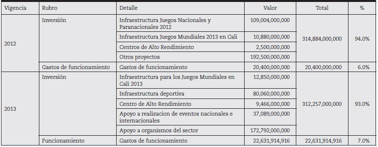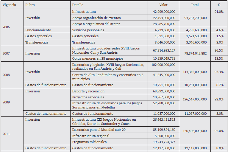 Se puede determinar que, en cada vigencia, más del 90% de los recursos se destina a los proyectos de inversión, especialmente los de infraestructura, y tienen mayor porcentaje de participación los escenarios para eventos deportivos como: Juegos Nacionales, Paranacionales, Juegos Suramericanos, Juegos Centroamericanos y del Caribe, Juegos Mundiales, etc. De ahí la importancia de ser sede de cualquier evento deportivo en Colombia, pues es la oportunidad para que el gobierno nacional realice grandes inversiones en obras de infraestructura tanto deportiva como física, pues permite que, una vez realizadas estas inversiones, se potencie la práctica deportiva y se fortalezca la preparación de sus deportistas, como es el caso de Zárate y Mariño (2011): “la realización del mundial Sub-20, en que la millonaria inversión en los estadios mejoró notablemente su aspecto y su capacidad de aforo, esfuerzo recompensado por la masiva asistencia, impulsando la dinámica económica del deporte más popular en Colombia”.