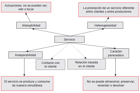 La Real Academia Española de la Lengua define el concepto de servicio como la prestación humana que satisface alguna necesidad social y que no consiste en la producción de bienes materiales. Ahora bien, desde un punto de vista más práctico, servicio se puede entender como “cualquier trabajo hecho por una persona en beneficio de otra” (Tigani, 2006, p. 26) o como “un hecho, una actuación, un esfuerzo” (Rathmell, 1966, citado por Fisk, Grove & John, 2013, p. 7). Otros autores con un enfoque de actividad plantean que los servicios son el cumplimiento de ciertas necesidades a través de actividades esencialmente intangibles, que proporcionan satisfacción y que no necesariamente están ligadas a la venta de un producto (Srinivivasan, 2009); acciones, esfuerzos o actuaciones, en donde la intangibilidad es la propiedad principal que lo diferencia de los bienes o mercancías (Hoffman & Bateson, 2010) o como “actividades económicas que crean valor y proporcionan beneficios para los clientes en momentos y lugares específicos, como resultado de producir un cambio deseado en su nombre (Lovelock, Vandermerwe, Lewis & Fernie, 2004). Desde esta última perspectiva, Zeithaml et al. (1985) lo analizan como actuaciones, en lugar de objetos, que no se puede ver, sentir, saborear o tocar como se hace con los bienes. Asimismo, definen cuatro características que hacen a un servicio diferente de una mercancía, como la inseparabilidad de la producción y el consumo, la heterogeneidad, el carácter perecedero y la intangibilidad, que es la diferencia fundamental frente a las mercancías. A esto, otros autores agregan dos características: el contacto con el cliente y la relación basada en el cliente (Pride & Ferrel, 2010) (figura 1).