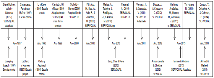 Frente a los modelos, se puede concluir que en el periodo revisado (2008-2014) se han trabajado las escalas SERVQUAL y sus adaptaciones, SERVPERF, HiEdQUAL y HedPERF, temporalidad que se puede contrastar en una línea de tiempo con el estudio realizado por Capelleras y Veciana (2001). En la figura 10 se puede observar la aplicabilidad de SERVQUAL, SERVPERF. Desde 1997 viene surgiendo la necesidad de elaborar escalas propias, basadas en los dos modelos más reconocidos; se observa también que, a partir de 2010, surgen nuevas escalas de medición que superan los vacíos de SERVPERF y SERVQUAL, pero solo su aplicación y validación mostrarán su bondad y utilidad.