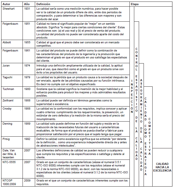 El concepto de calidad según Garvín (1988) ha evolucionado cronológicamente en varias etapas que se complementan mutuamente; la primera está asociada a la etapa de inspección, donde el énfasis es la uniformidad del producto, y a través de la valoración y medición garantizar que dicho producto cumpla con los estándares establecidos, la segunda, el control estadístico de la calidad, donde se reducía la inspección y se utilizaban técnicas estadísticas para el control de lotes de producción. En cuanto a la tercera, relacionada con el aseguramiento de la calidad, toda la cadena de producción, desde el diseño hasta el mercado, participaba activamente para evitar fallos de calidad; finalmente, la calidad como estrategia competitiva, se enfatiza en el mercado, en la necesidad de los clientes y moviliza a la organización para desarrollar, mantener y mejorar la calidad. Sin embargo, no se encuentra una definición unificada sobre el concepto de calidad, y dependiendo del contexto sobre el cual se aborde, puede enfatizar ciertos elementos que se han mantenido a lo largo del tiempo.