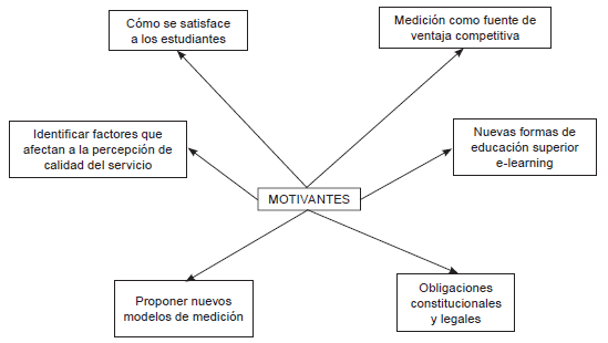 Con base en lo anterior y en concordancia con la figura 3, se puede concluir, que las motivaciones para este tipo de investigaciones son múltiples, desde un marco jurídico que establece la obligación de ofrecer servicios educativos de calidad hasta adelantar mediciones como fuente de ventaja competitiva, para poder afrontar la dinámica global de la actual economía; además, es notorio que el surgimiento de nuevas formas de educación que afectan a la forma de relacionarse entre academia, docente y alumno requiere la identificación de nuevas dimensiones de análisis para las herramientas de evaluación. Pareciera que el interés por este tipo de mediciones viene desde la perspectiva académica y no directamente desde los proveedores de los servicios (instituciones de educación superior) como organizaciones, lo cual no obvia la necesidad de entender al estudiante como uno de los clientes de este tipo de servicios, quien en últimas es quien vive todo el proceso de formación, incluidos los procesos de apoyo para lograr los propósitos.